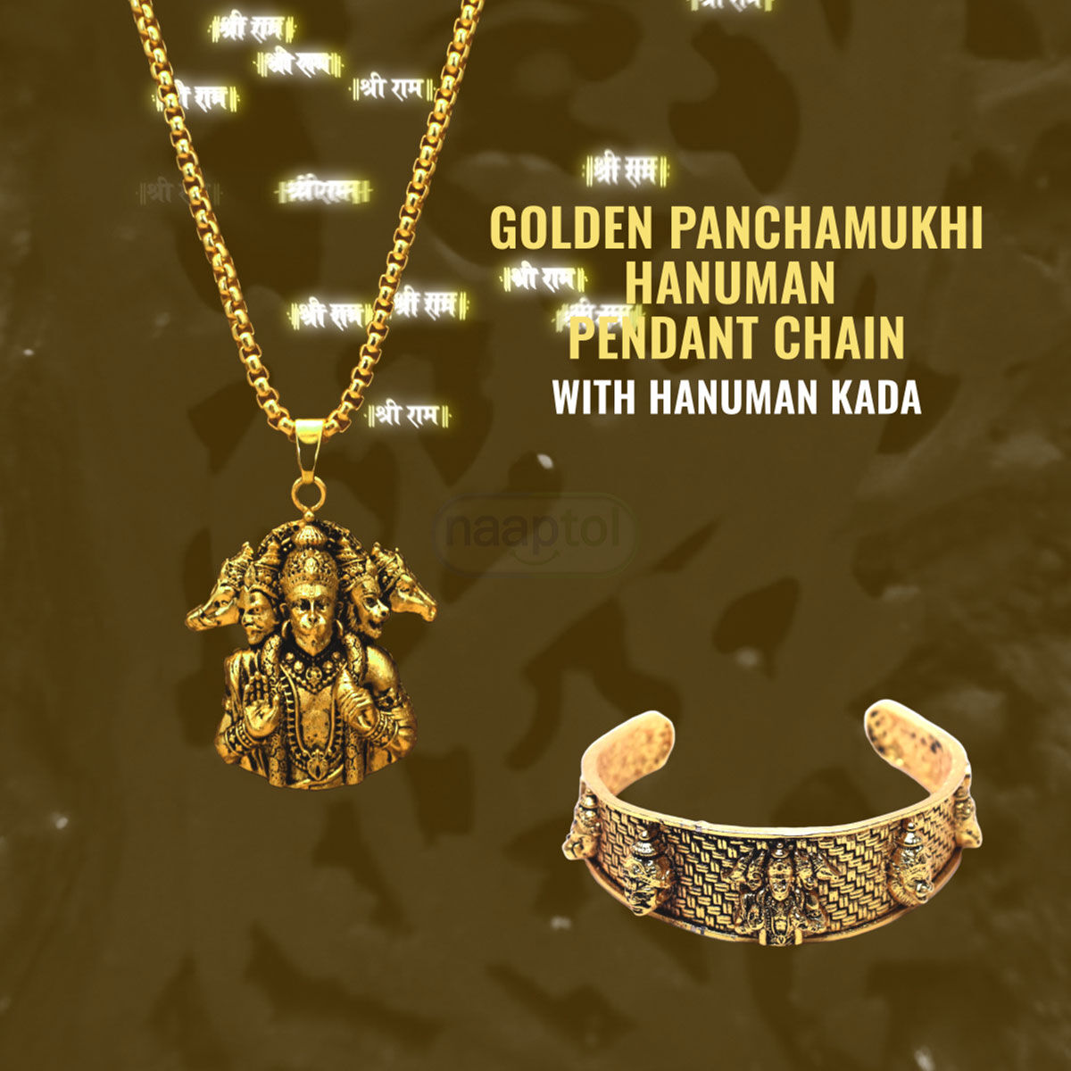 Experience the divine presence of Panchmukhi Hanuman with this stunning golden finish pendant and chain paired with a matching Hanuman Kada. The intricately designed five faced Hanuman pendant symbolizes complete protection, courage, and victory over negativity. The adjustable Kada features detailed craftsmanship and the sacred ?Jai Shree Ram? engraving, making it a powerful spiritual accessory. Perfect for daily wear or gifting, this premium combo brings strength, positivity, and devotion into everyday life. A stylish yet deeply meaningful way to stay connected to Lord Hanumans boundless blessings.