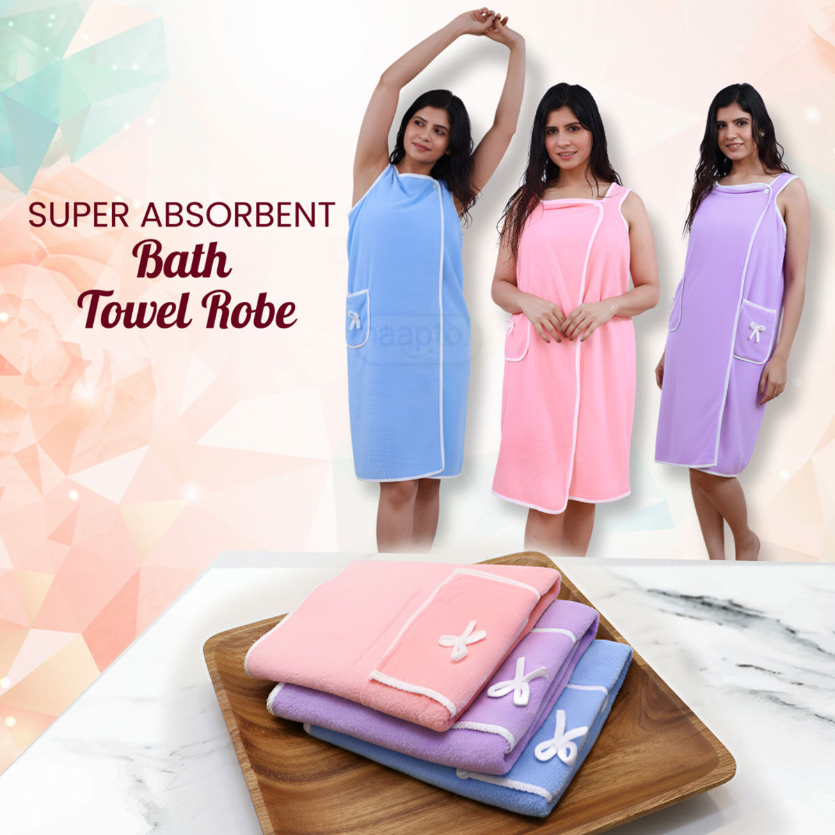 Wrap yourself in instant dryness and luxurious comfort with this super absorbent bath towel robe made from premium microfiber. It absorbs water in seconds, letting you step out of the shower feeling completely dry without any rubbing. The clever towel-cum-robe design stays securely in place, freeing your hands to style hair, apply skincare, or simply relax. Lightweight, quick drying, and incredibly soft on the skin, its perfect for daily use, spa days, beach trips, or travel. Available in elegant Pink, Blue, and Purple shades, it combines style, convenience, and ultimate post shower pampering in one must-have essential.