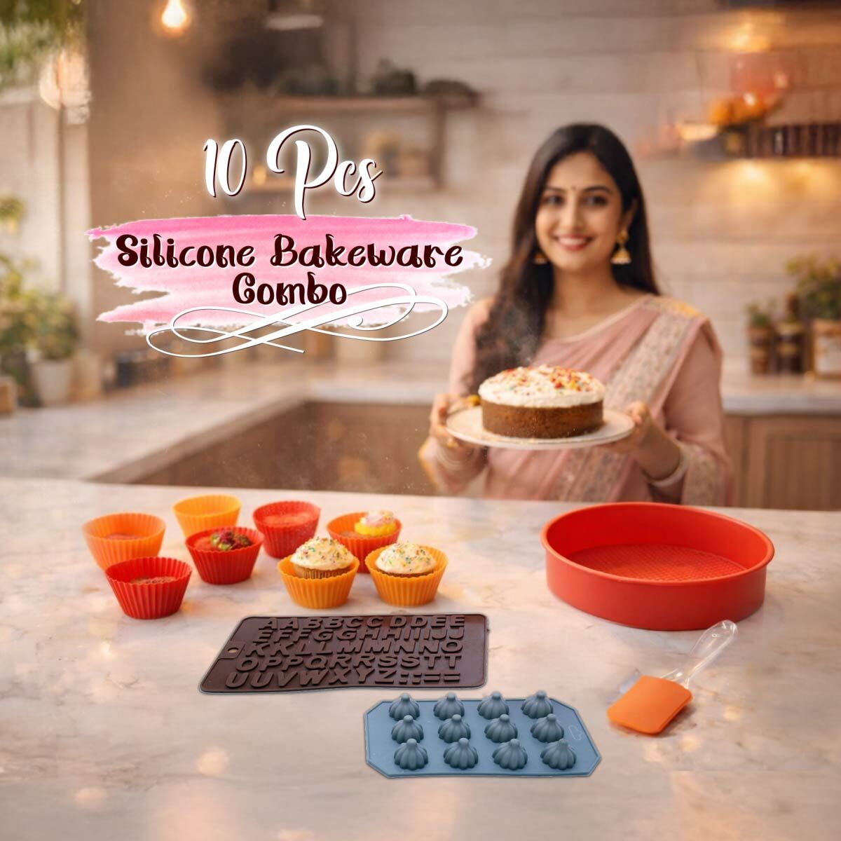 - Complete Baking Combo Set: Includes round cake pan, cupcake moulds, chocolate moulds, and spatula - everything you need to start baking.