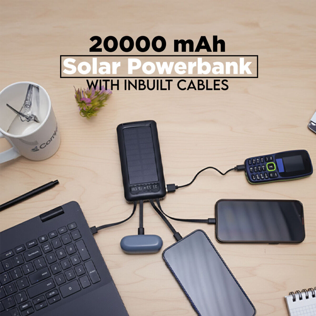 A powerful 20000 mAh solar powerbank designed for unstoppable performance wherever you go. Equipped with inbuilt cables, LED display, and torch, it keeps your devices charged even when theres no electricity around.