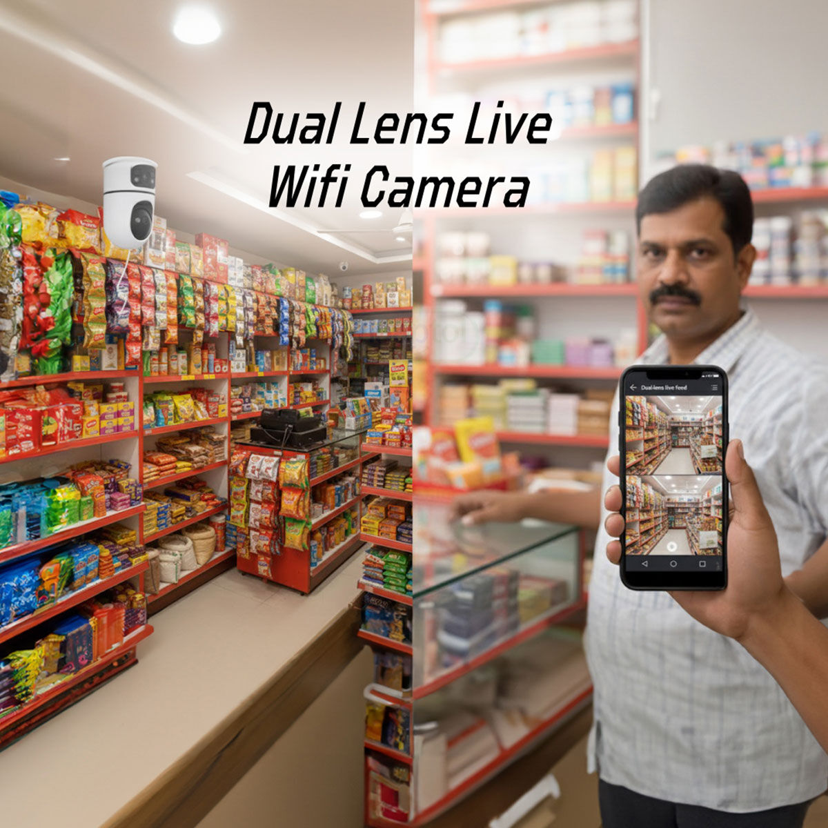 The Dual Lens Live WiFi Camera gives you complete indoor protection with two live views at the same time. With smart motion tracking, enhanced night vision, and two way calling, you can monitor and control your shop from anywhere using your mobile app. Perfect for retail stores, warehouses, and offices.